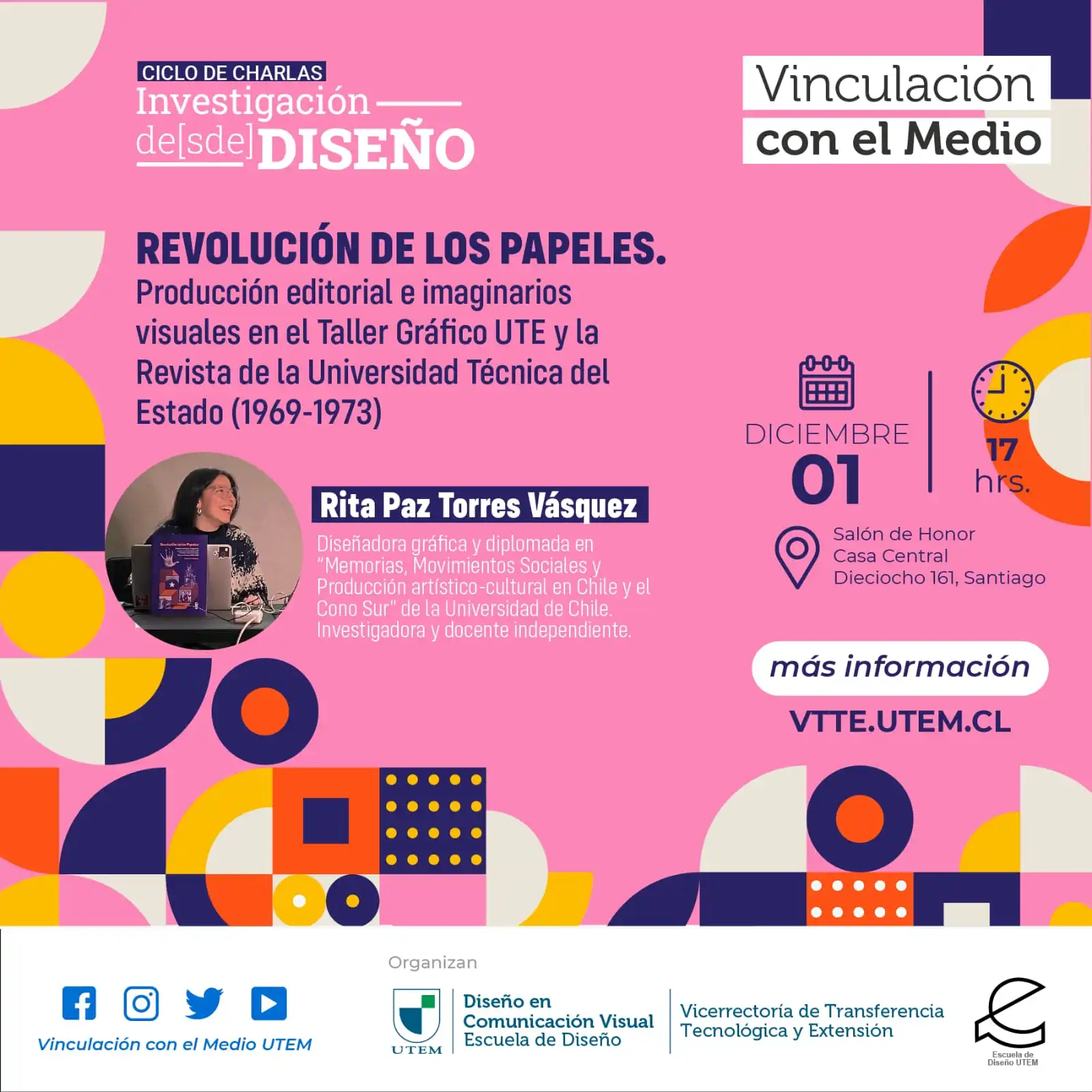 Se llevará a cabo el día Jueves 01 de Diciembre a las 17:00 hrs, en el Salón de Honor, Casa Central ubicada en Dieciocho #161, Santiago. En esta oportunidad expondremos: “Revolución de los papeles: Producción editorial e imaginarios visuales en el Taller Gráfico UTE y la revista de la Universidad Técnica del Estado (1969-1973)”, el cual será impartido por: