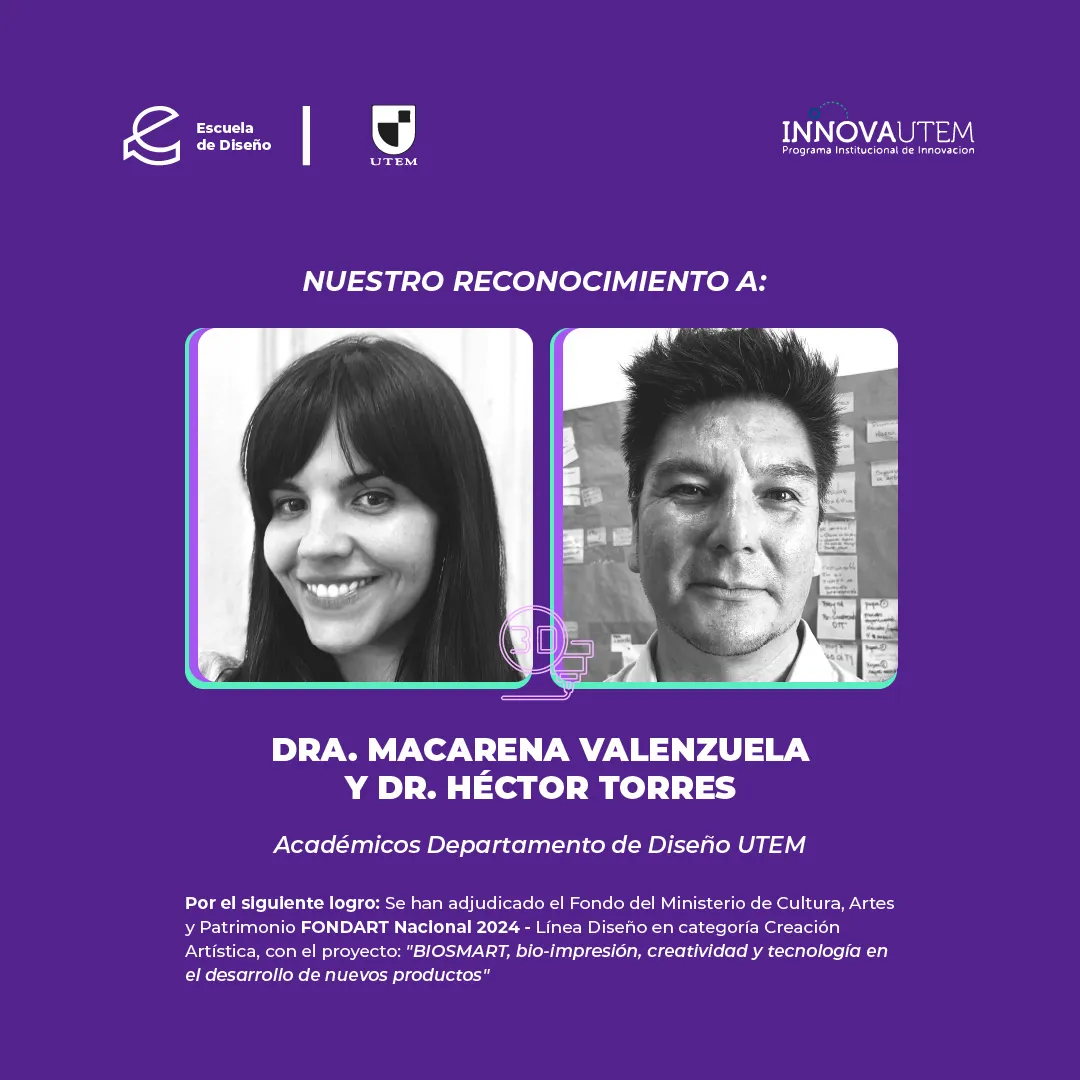 Queremos reconocer a nuestros académicos del Departamento de Diseño Dra. Macarena Valenzuela (@macasss) y Dr. Héctor Torres (@hantorres1), quienes en conjunto con el equipo INNOVA UTEM (@innovautem) se adjudicaron el Fondo del Ministerio de Cultura, Artes y Patrimonio “Fondart Nacional 2024”, Línea Diseño categoría Creación Artística, con el proyecto de innovación “BIOSMART, bio-impresión, creatividad y tecnología en el desarrollo de nuevos productos”.
