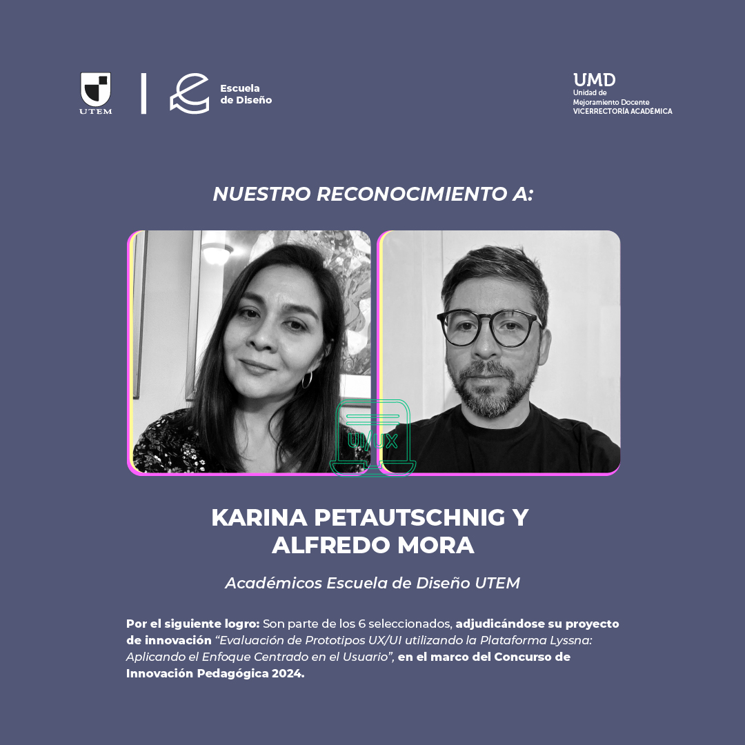 Queremos reconocer a nuestros académicos de Diseño en Comunicación Visual Karina Petautschnig (@kariloisi) y Alfredo Mora (@un_alfredo), quienes fueron seleccionados dentro del Concurso de Innovación Pedagógica 2024, adjudicándose su proyecto “Evaluación de Prototipos UX/UI utilizando la Plataforma Lyssna: Aplicando el Enfoque Centrado en el Usuario”.