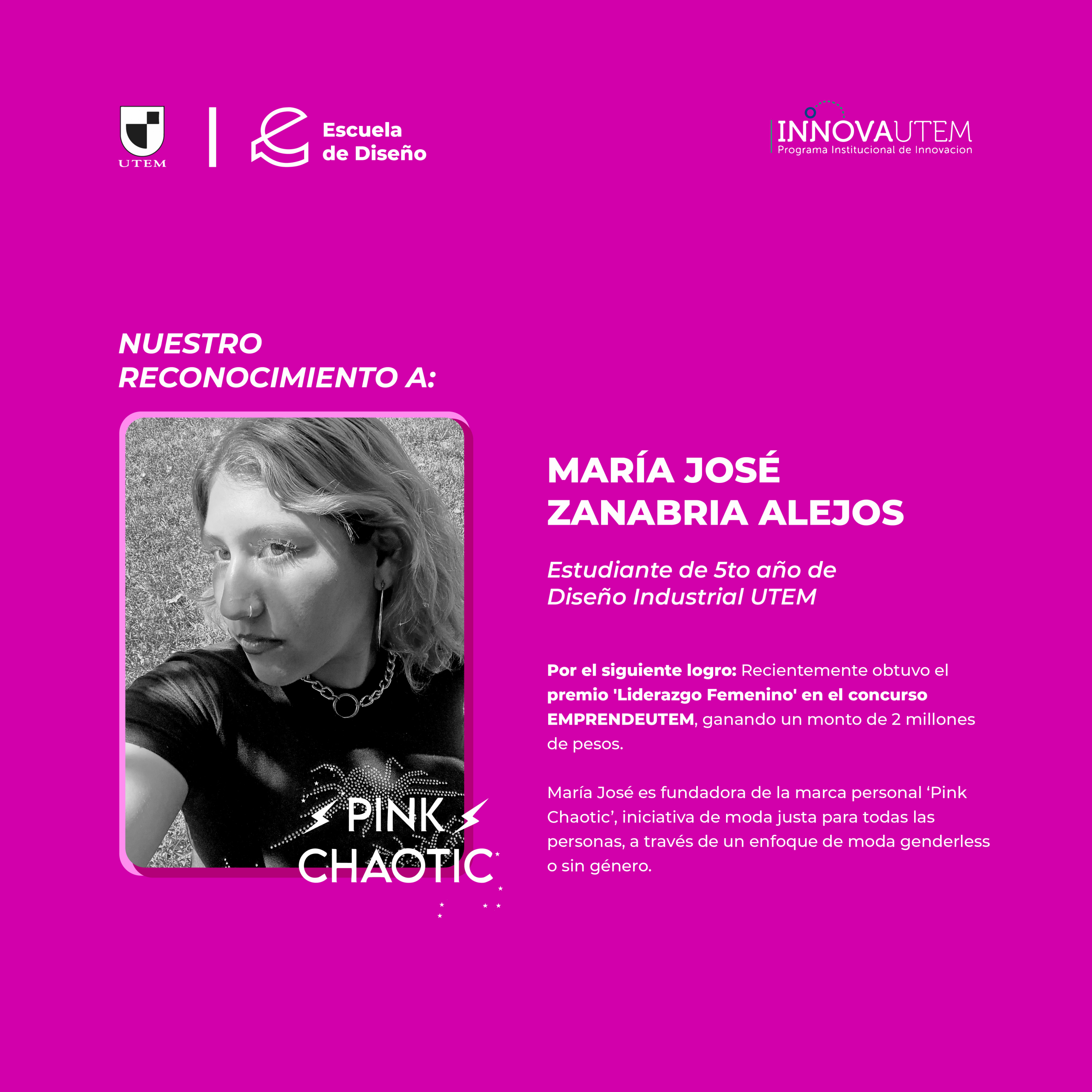 🏆 En ese sentido, Zanabria fue la ganadora en la categoría ‘Liderazgo Femenino’ con su emprendimiento ‘Pink Chaotic’ @pink.chaotic, una propuesta vinculada a la economía circular, donde confecciona líneas de vestuario genderless (sin género) a través del ‘upcycling’, una técnica de reutilización de prendas que les brinda una nueva vida útil. Pink Chaotic se dirige a las personas que buscan sentirse seguros/as con su cuerpo, por medio de una identidad única. El premio otorgado fue de $2.000.000, los cuales serán invertidos en nueva maquinaria, espacios y elementos que ayudarán a la customización de productos.