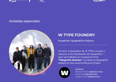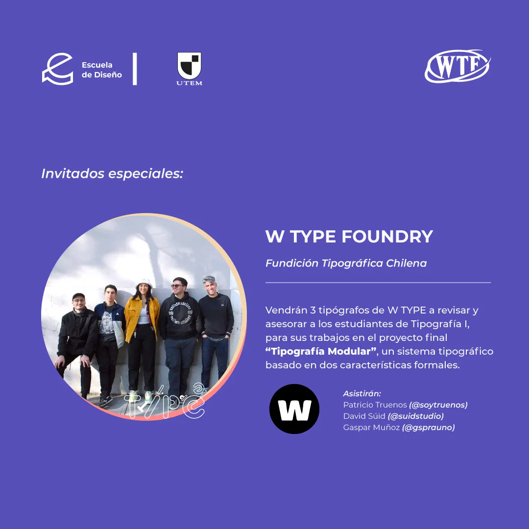 🤓 En esta oportunidad, 3 tipógrafos de la fundición tipográfica chilena “W Type Foundry” (@wtypefoundry) estarán presentes como invitados en las últimas correcciones de la entrega final del ramo de Tipografía I: Patricio Truenos (@soytruenos), David Súid (@suidstudio) y Gaspar Muñoz (@gsprauno).