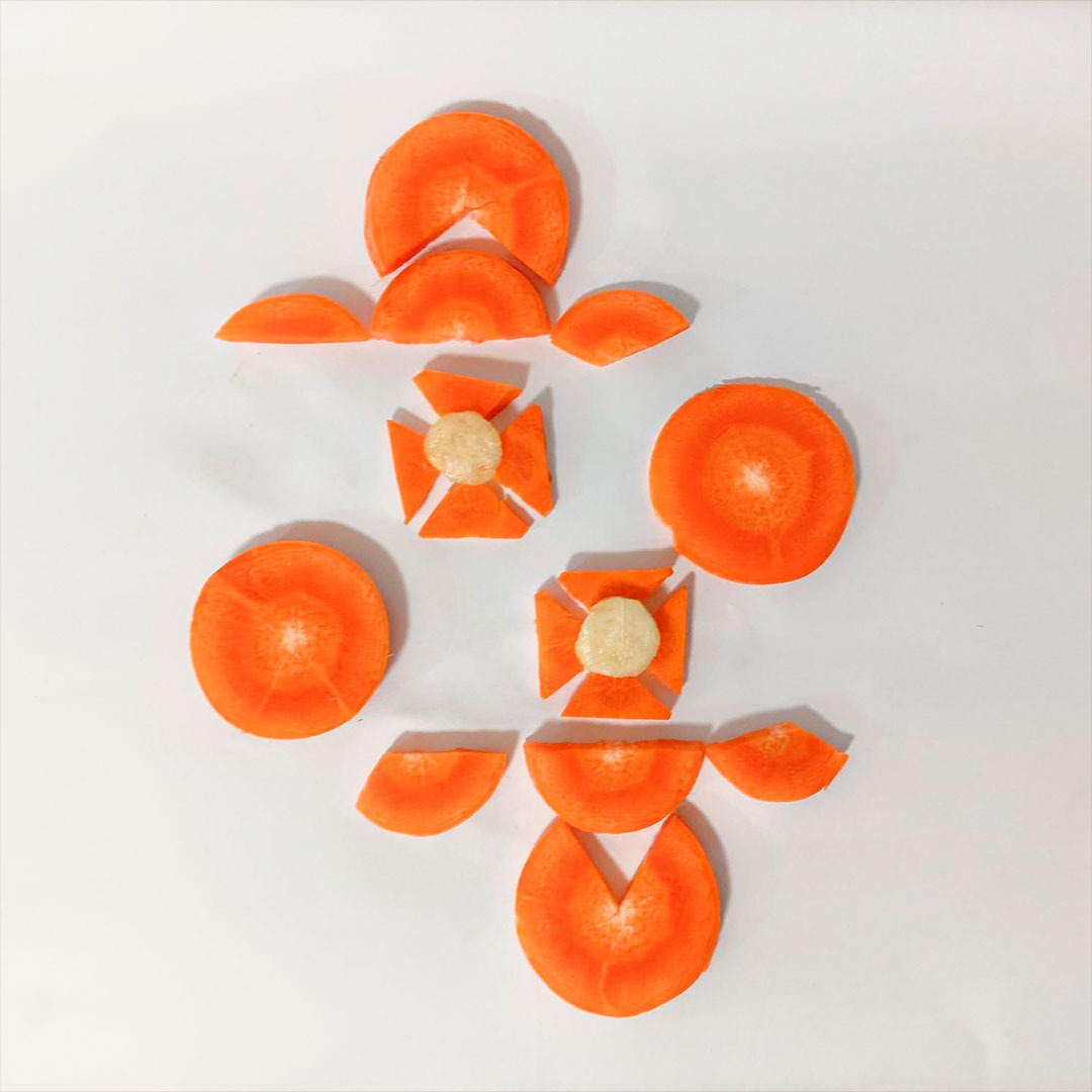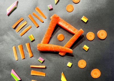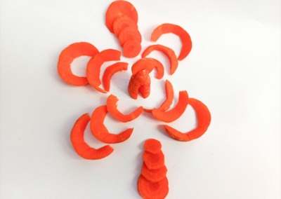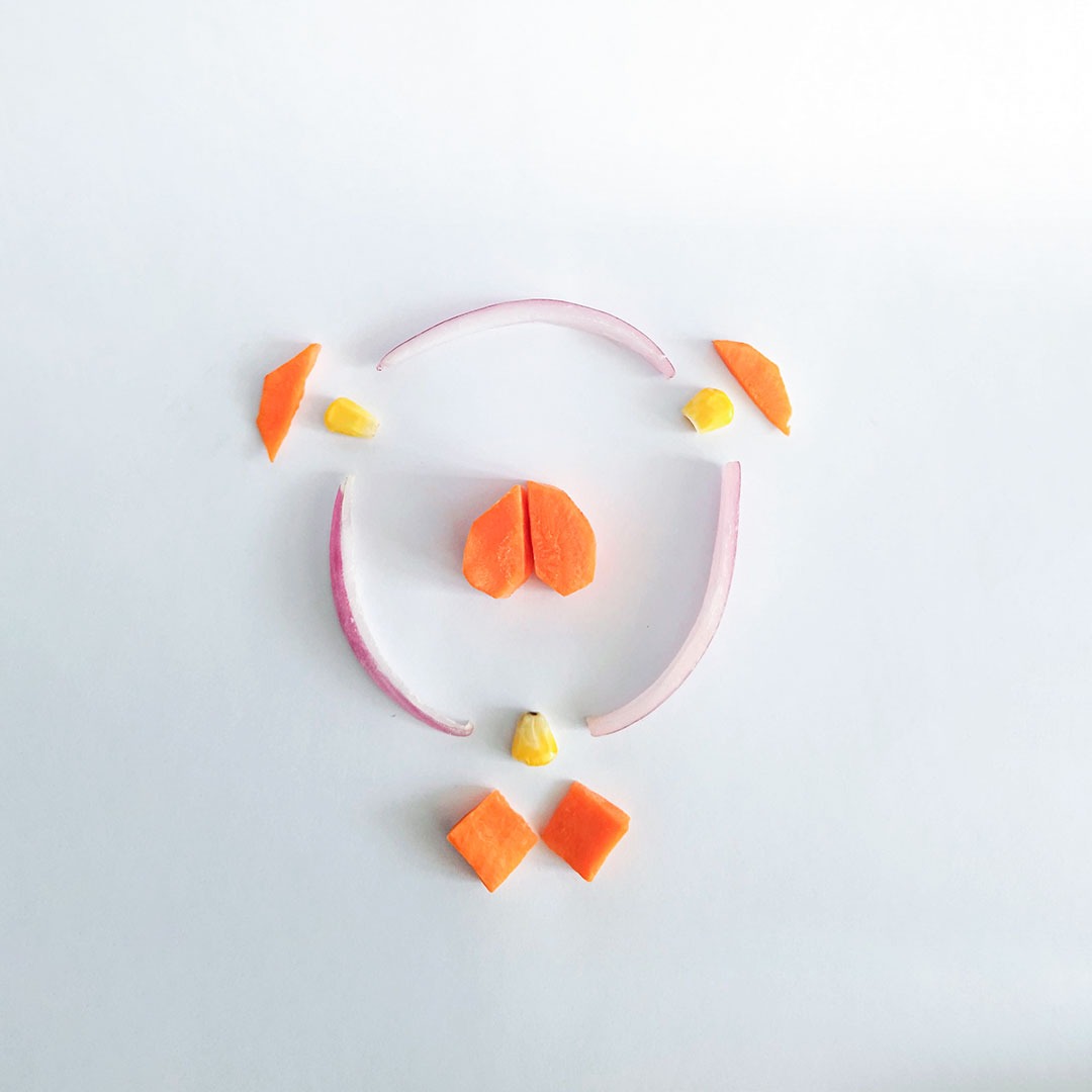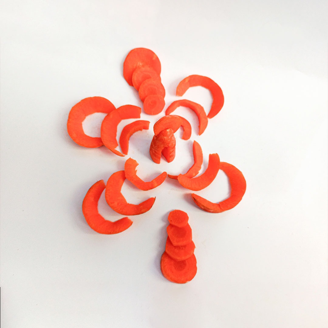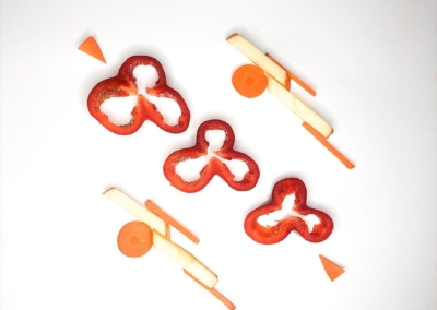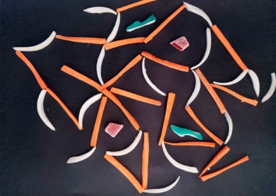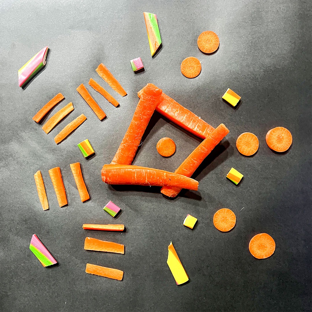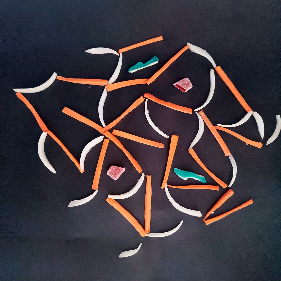 En este caso, mostramos el proceso de disección de elementos comestibles, donde los estudiantes tuvieron que realizar estructuras y formas a partir de comida. Se realizaron diferentes patrones en el canvas, como bocetos previos a la composición digital.