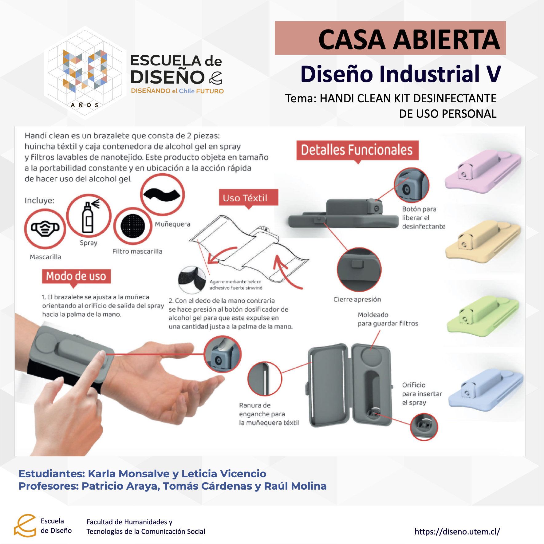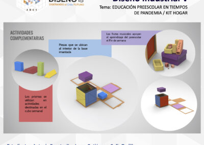 Los/las/les estudiantes diseñaron un producto de complejidad media en el ámbito de las restricciones sociales dentro del hábitat en pandemia COVID-19, incorporando las variables propias del contexto con un nivel de factibilidad técnica – funcional, productiva y económica. Los objetivos a cumplir fueron: Construir objetos para el hábitat (hogar), que empatizan con el contexto incorporando soluciones en su modo de uso y funcionamiento, Estructurar elementos utilitarios que resuelvan actividades en el ámbito de la salud preventiva, identificando las nuevas necesidades – oportunidades en los diferentes niveles de afectación dentro del hogar y Considerar variables productivas en el desarrollo de la propuesta, incorporando referencia de industria existente en todos sus contextos actuales