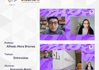Las/los/les estudiantes aplicaron un trabajo de preproducción, producción y postproducción a las videollamadas, en esta ocasión bajo el contexto “Entrevistas”, desarrollando relatos verbo visuales con diferentes estilos gráficos en soportes estáticos y dinámicos, considerando las tecnologías.